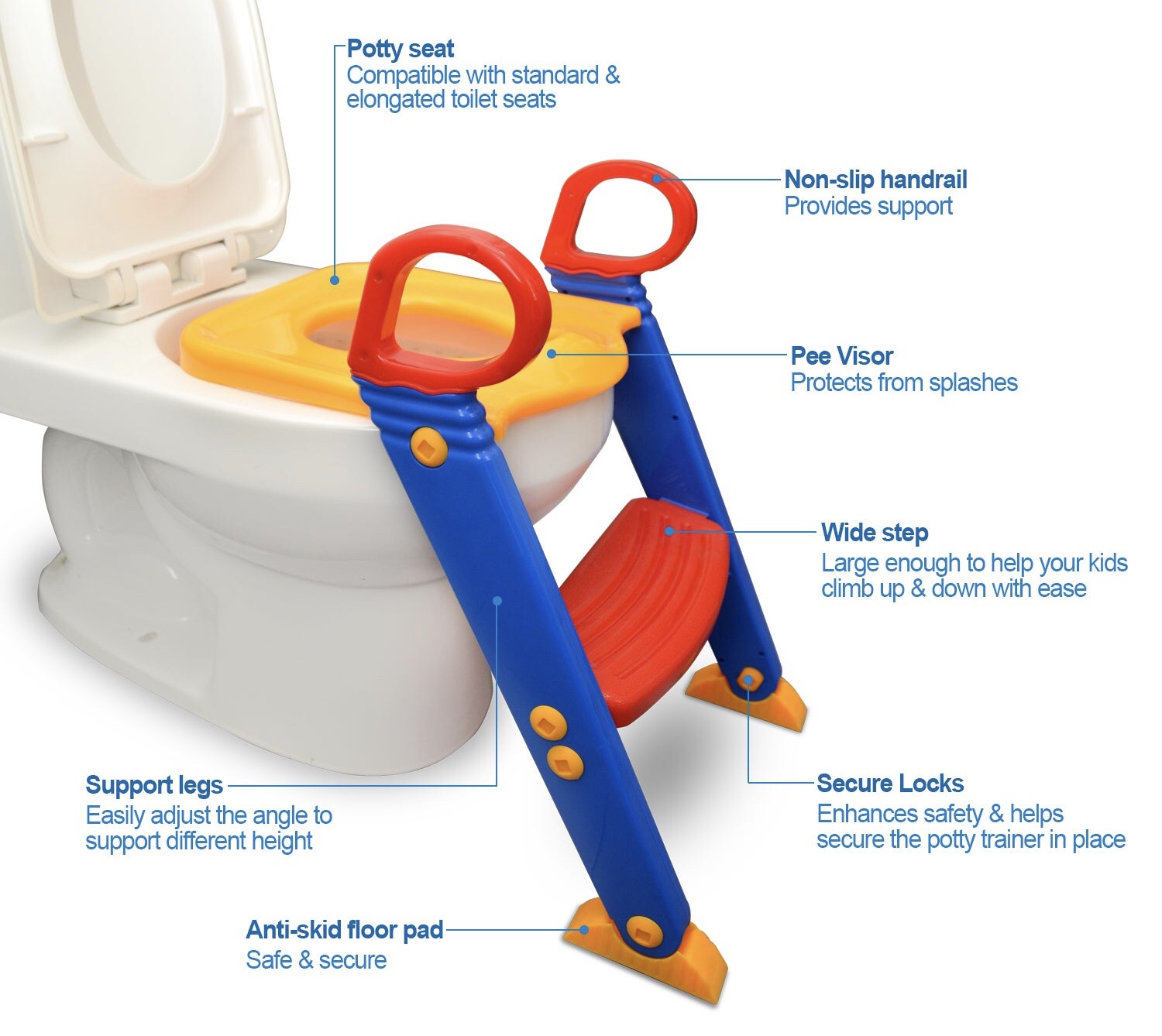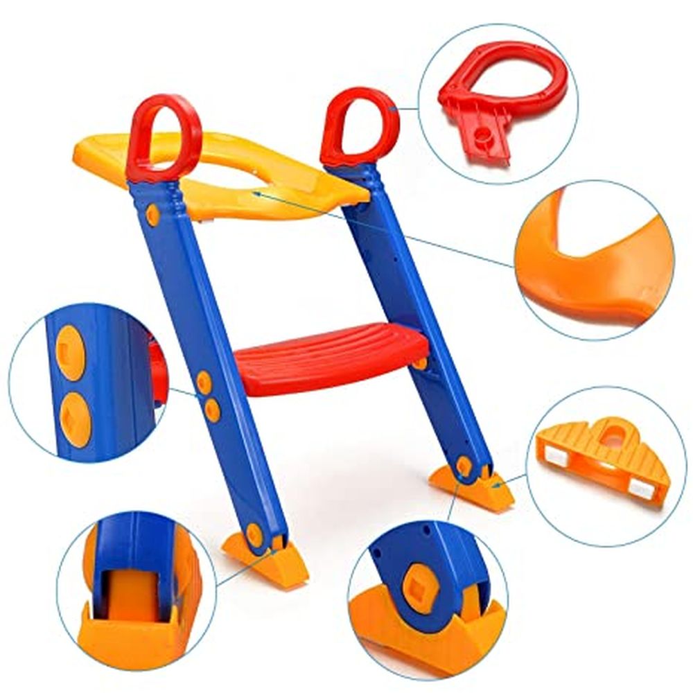 Moreover, It enables children to reach and sit safely on the toilet by themselves with the sturdy design. It also features a wide seat with splash guard and easy to grip no-slip handles perfect for even tiny hands. The extra wide step helps your child to easily access your home toilet. Extra wide floor pads give the unit a firm and safe anchor without the use of hardware or permanent installation. In addition, the entire unit folds easily and compactly for safe storage in closets or behind doors. Help you little one take those final steps with this safe and easy to use potty trainer.